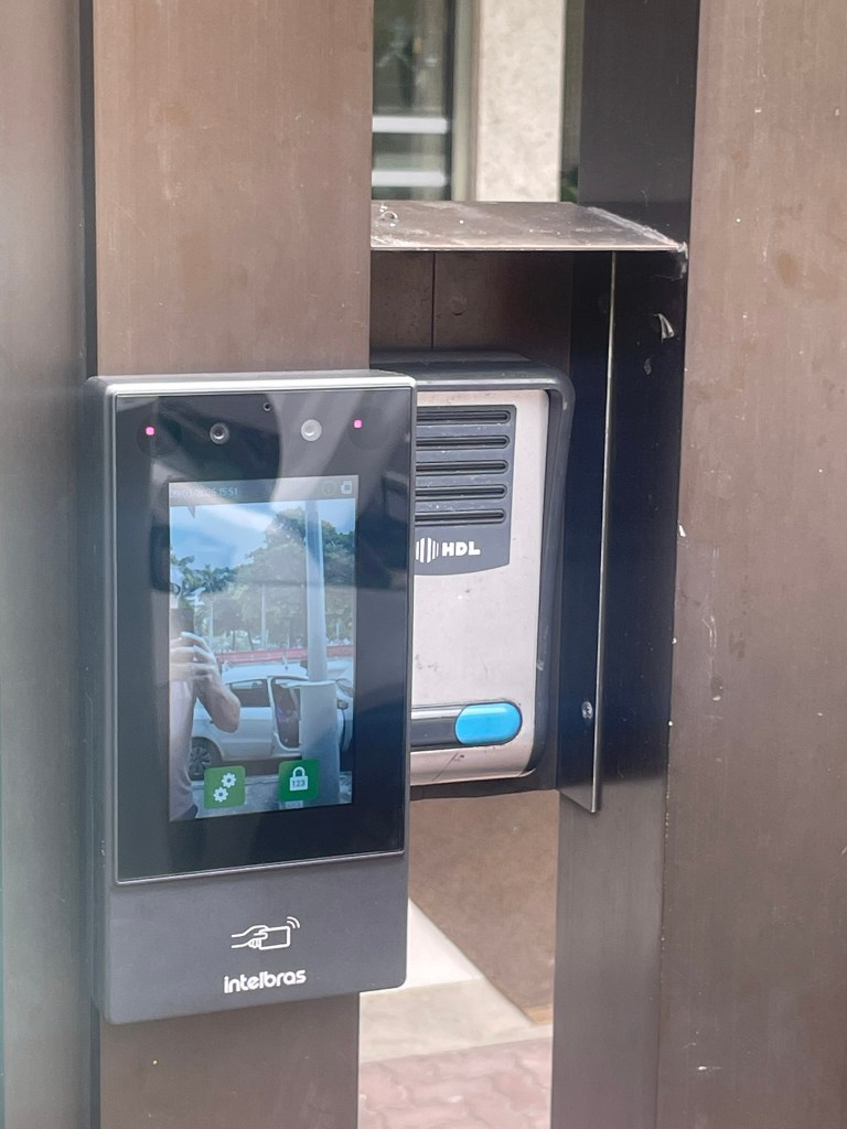 Instalamos um leitor biométrico facial integrado ao dispositivo de abertura do portão externo. Com este equipamento é possível comandar a abertuda da porta através da leitura da face, simplificando e tornando o acesso à área interna do prédio mais célere.